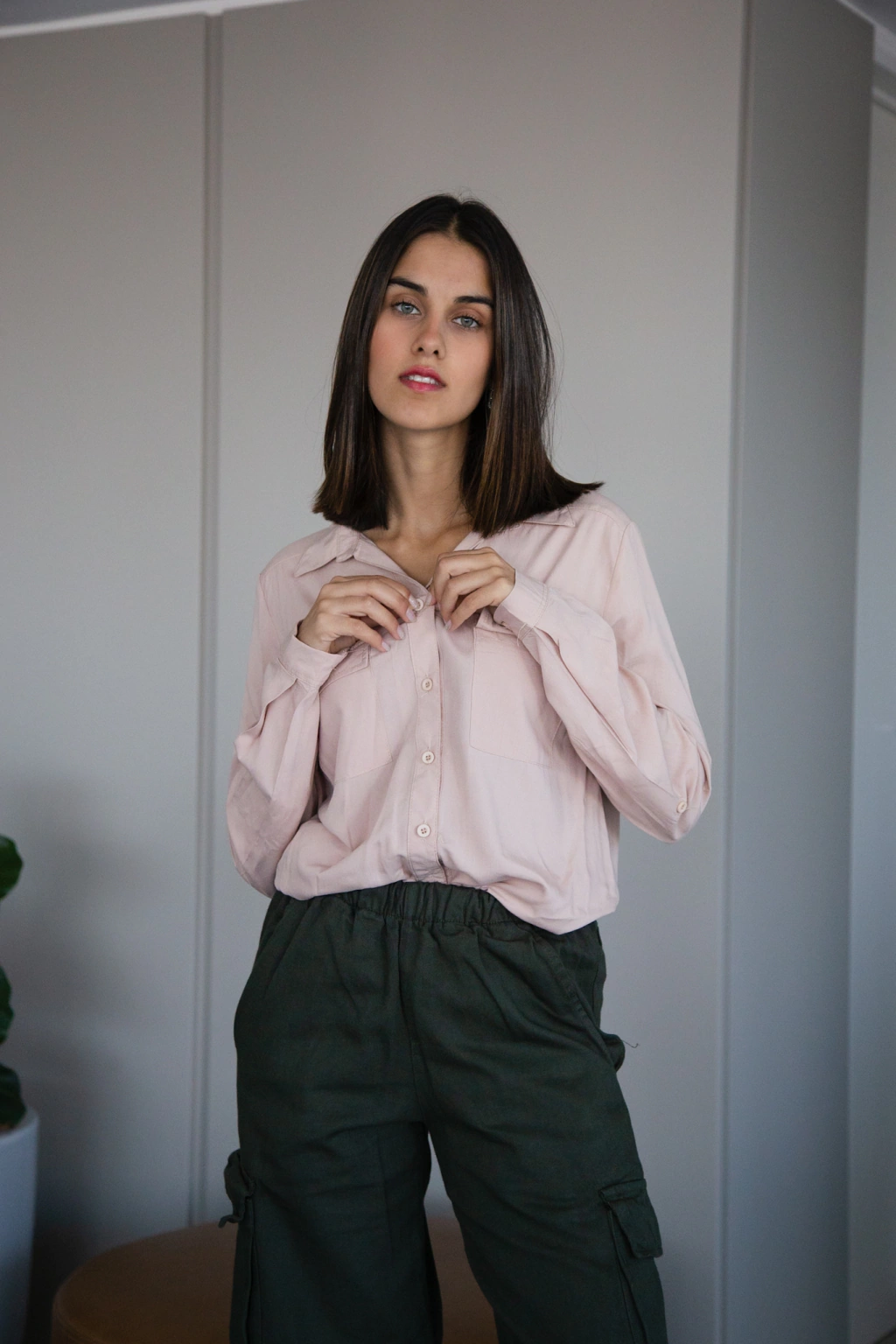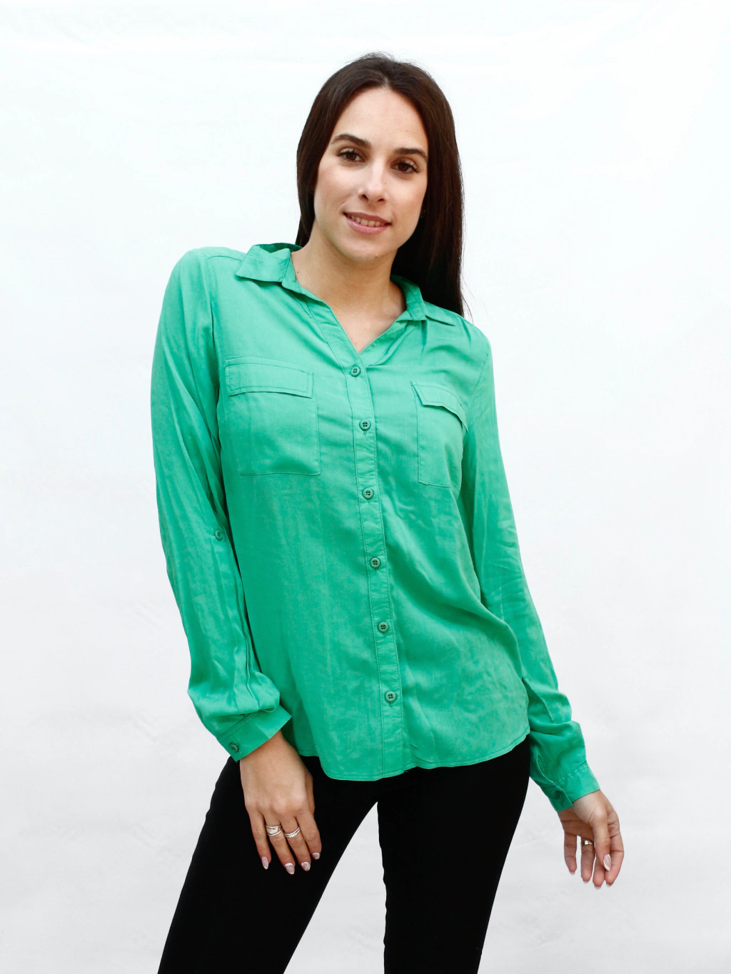 Fibrana con buena caida, bien suelta. Dos bolsillos en el frente.