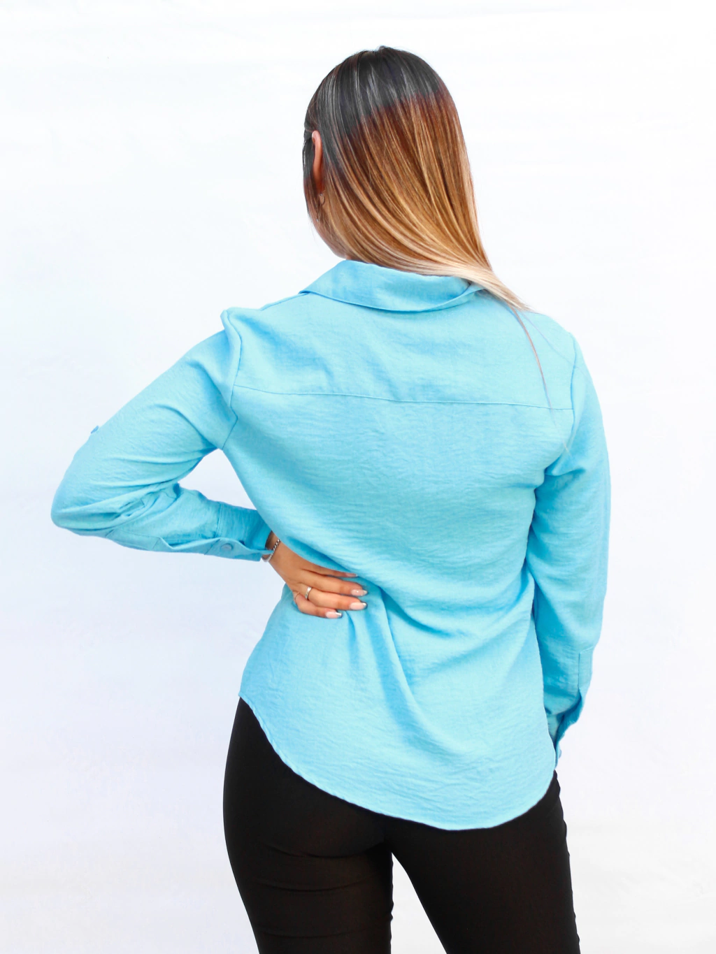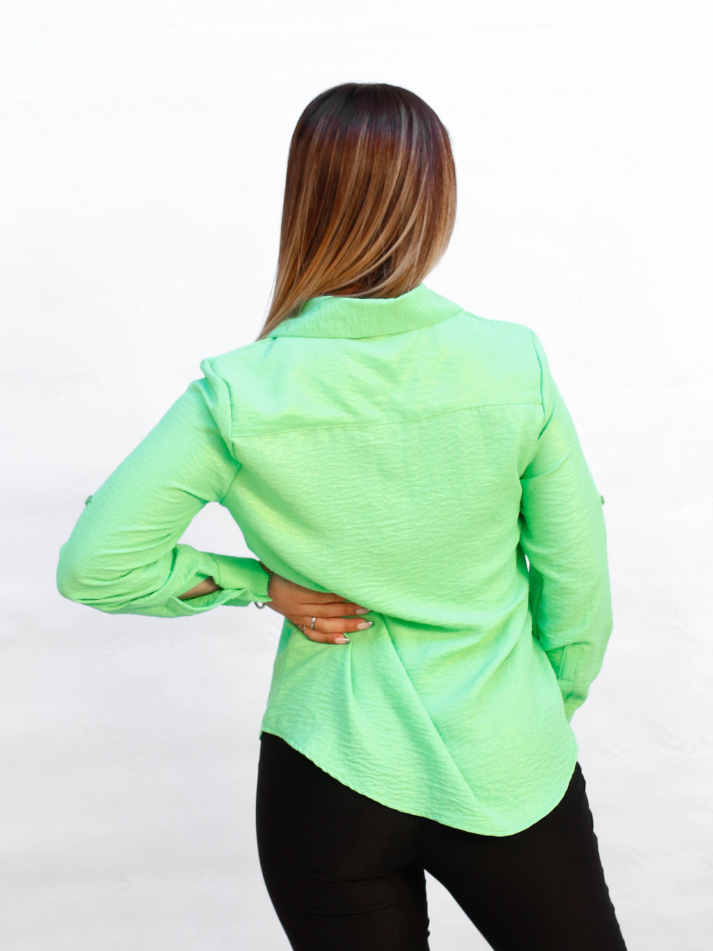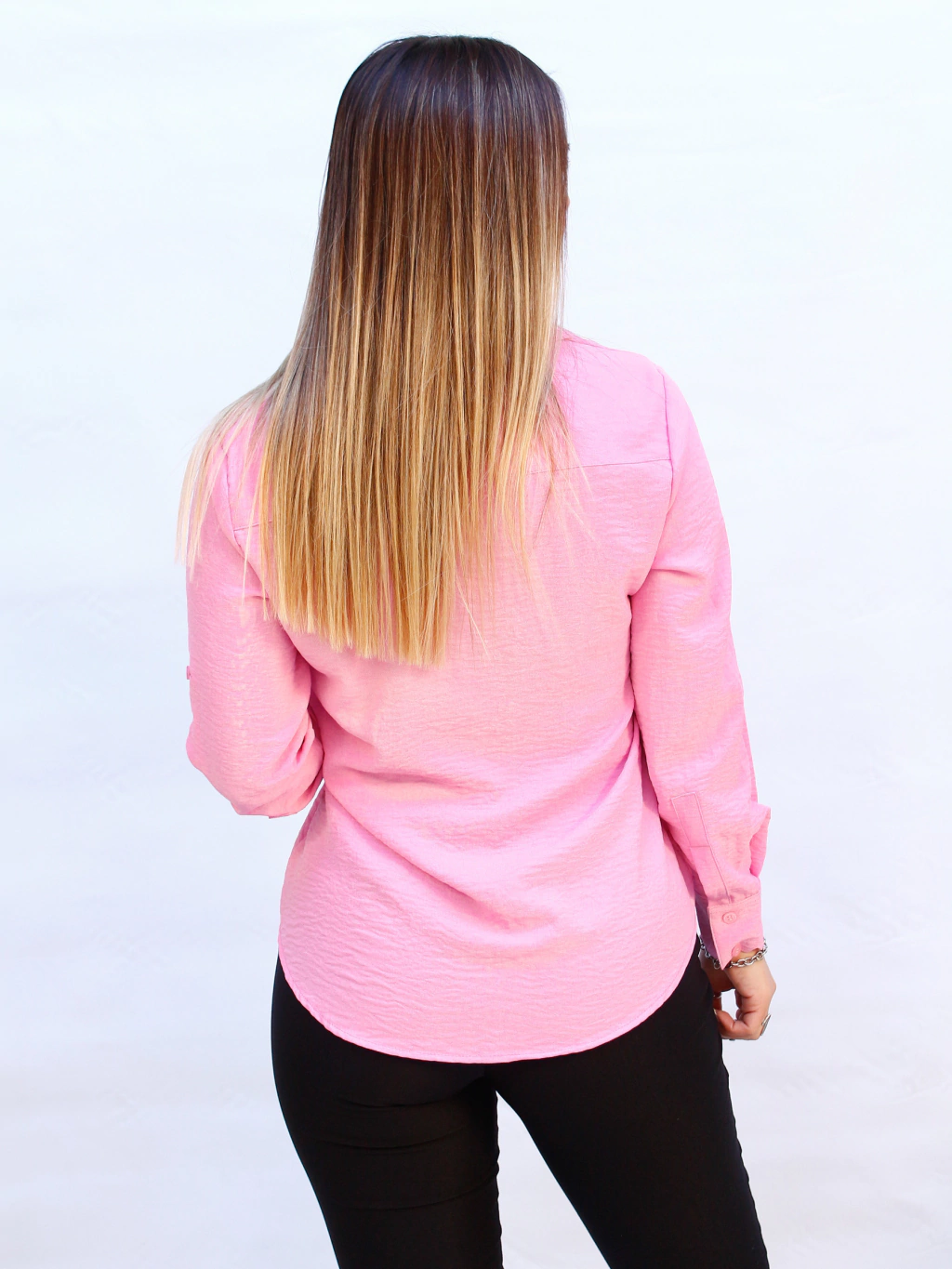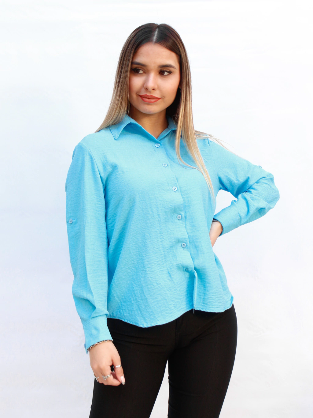 Camisa ente tela Crep brilloso. Es una tela con bastante brillo, tipo pupirina.