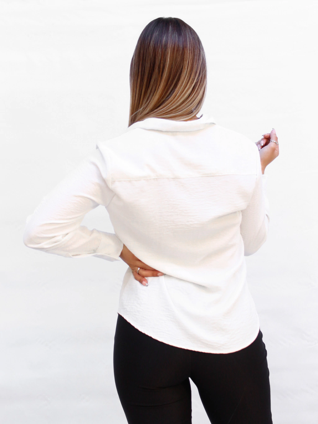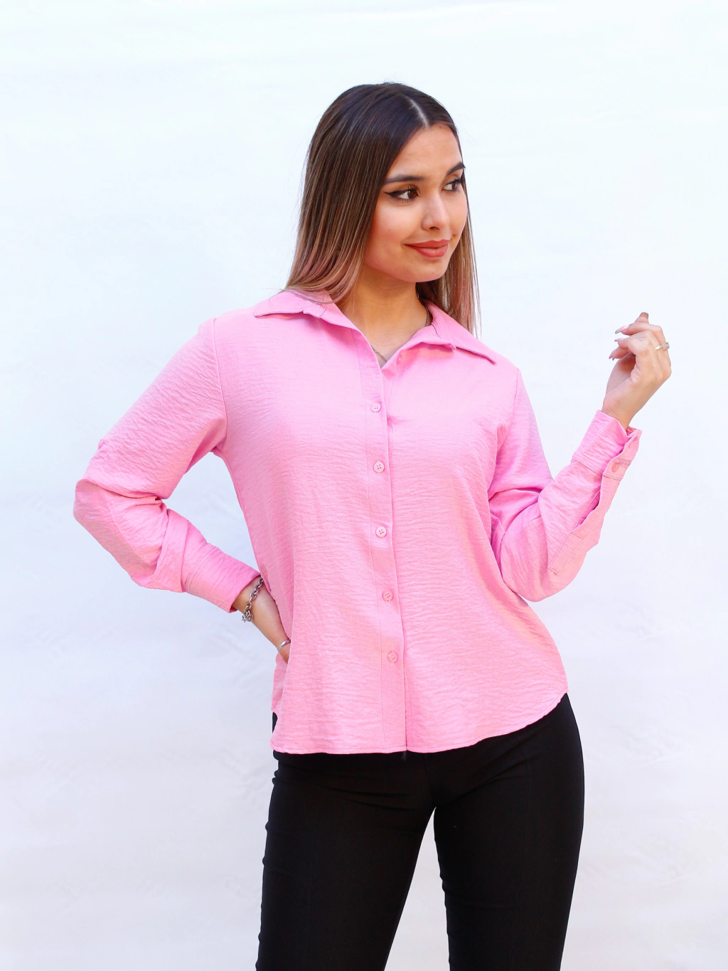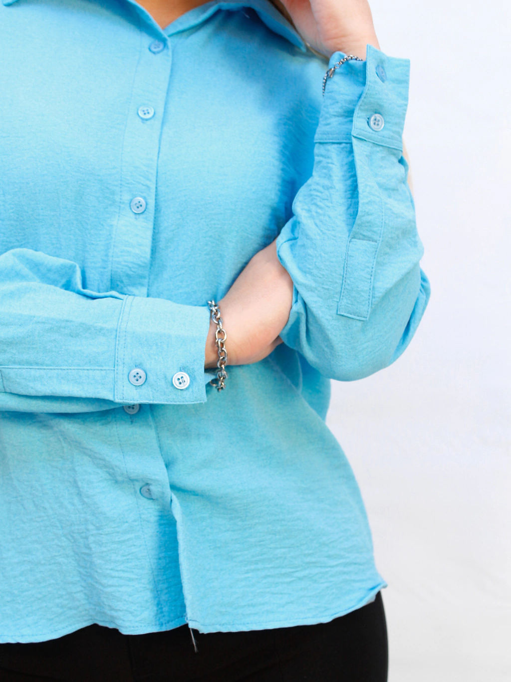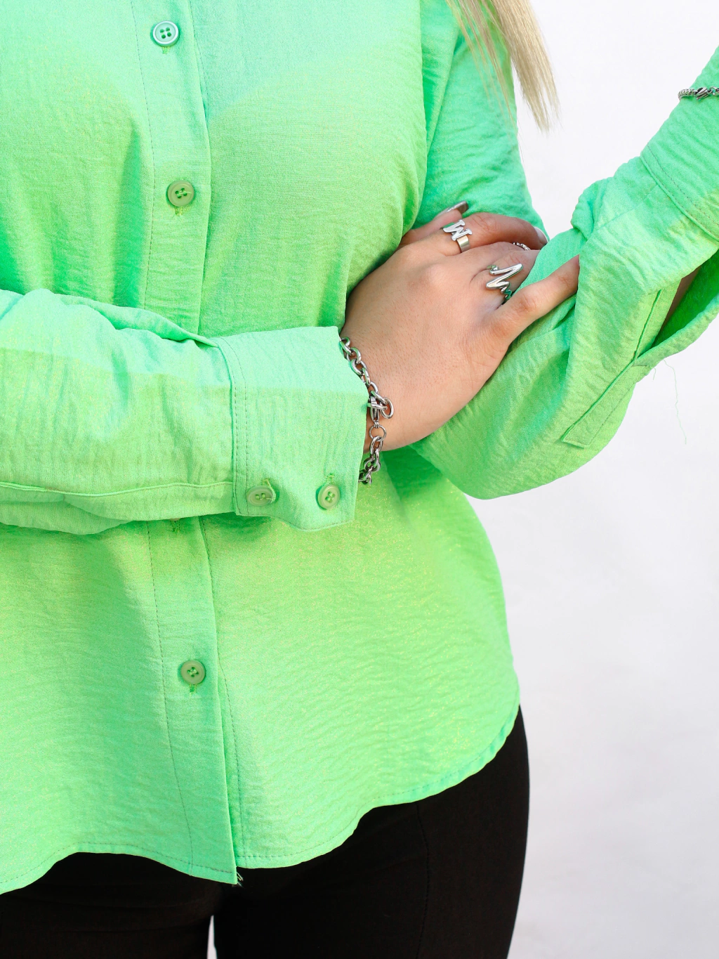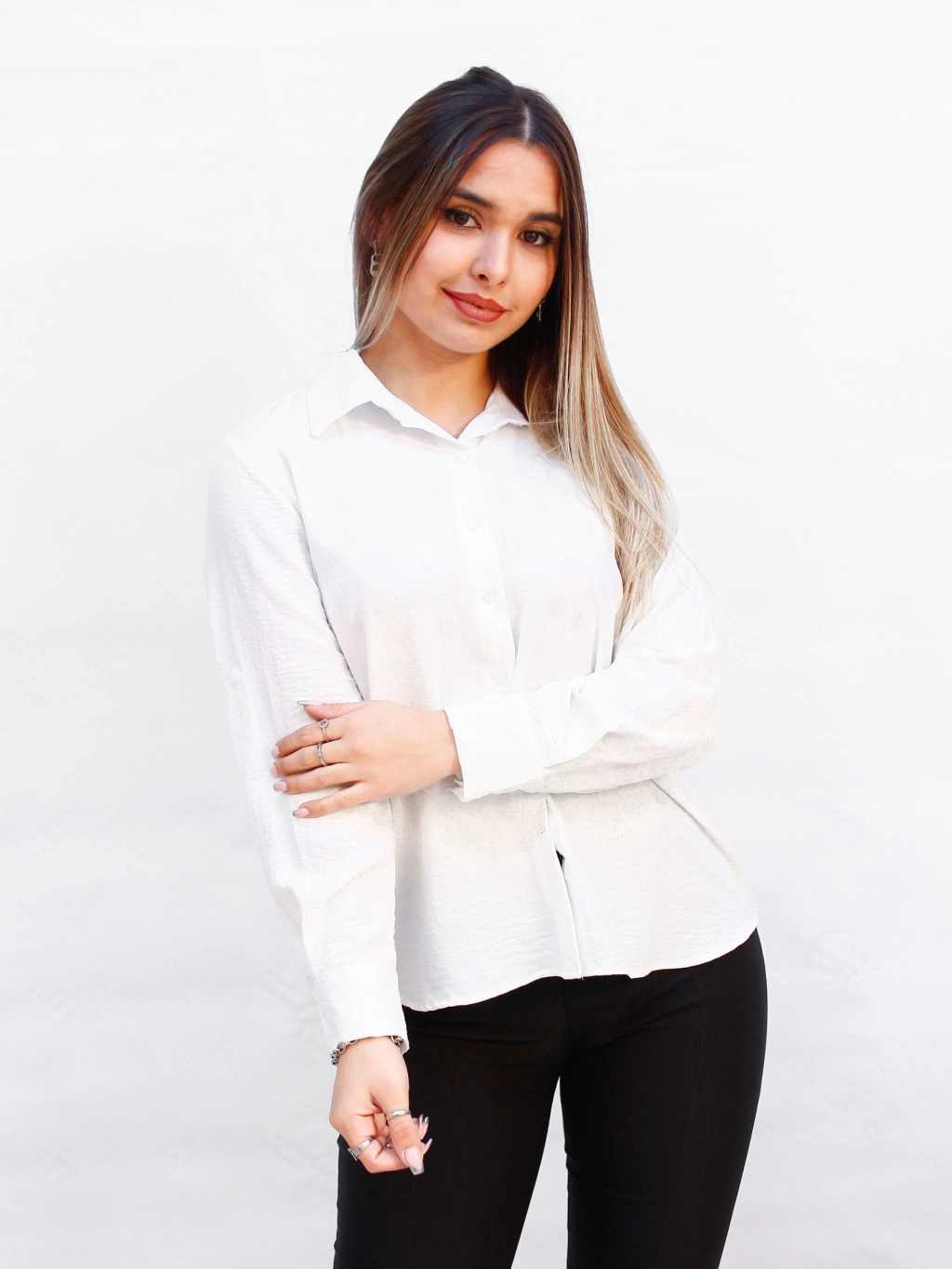 Camisa ente tela Crep brilloso. Es una tela con bastante brillo, tipo pupirina.