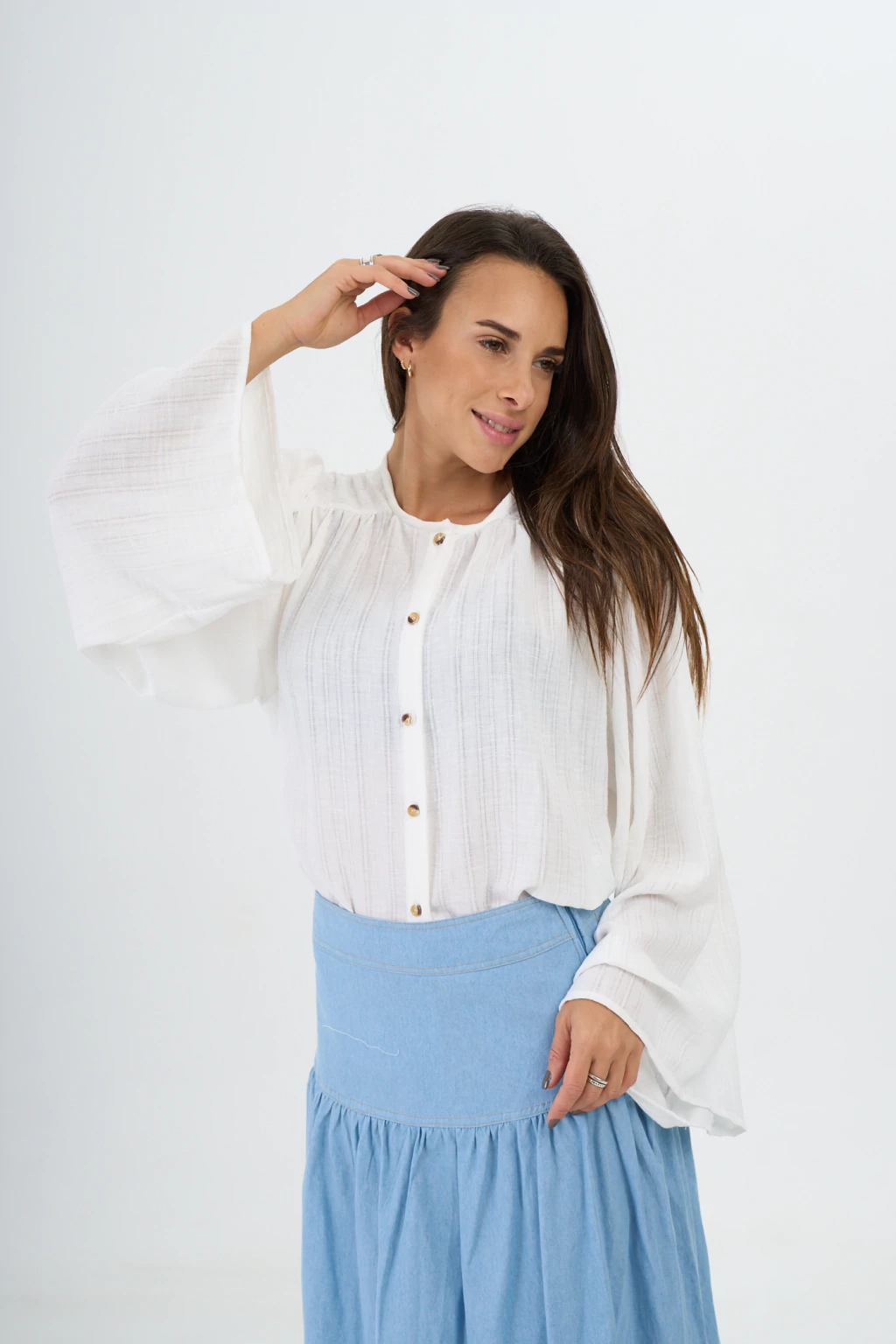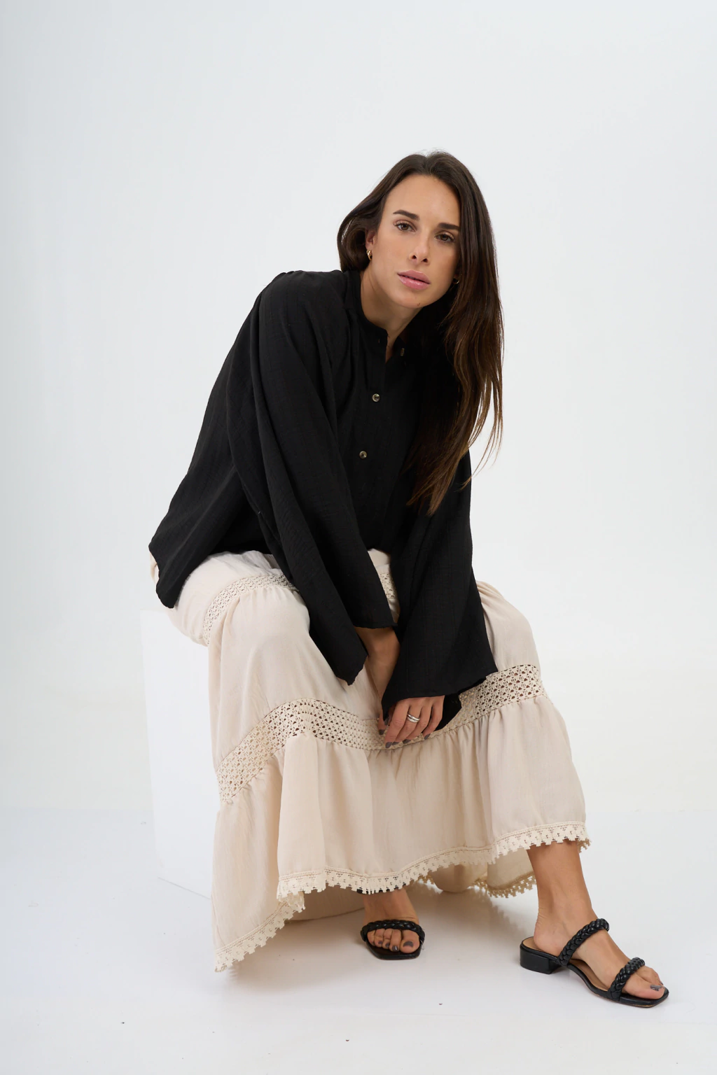 Ideal para usar sola o combinada con pantalones sastreros y blazers de la colección. La tela de algodón de alta calidad garantiza suavidad y durabilidad, perfecta para el clima variable de Argentina.