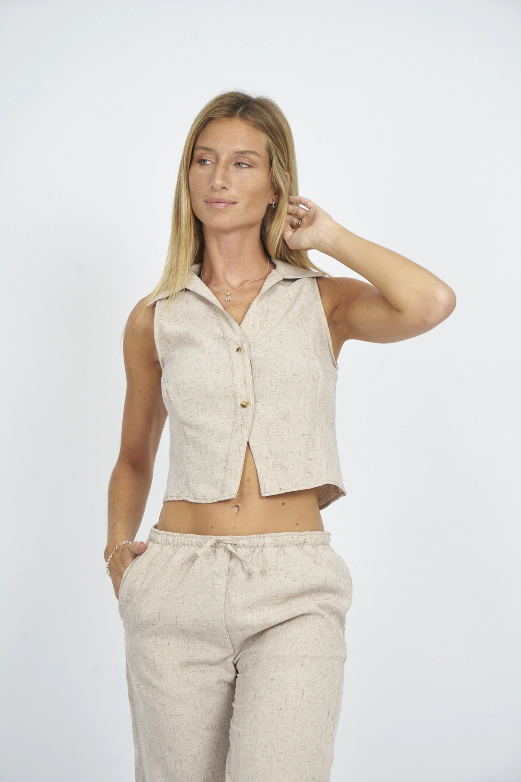 Descubre nuestro elegante chaleco jaspado entallado, confeccionado en tela simil lino que garantiza frescura y comodidad. Este modelo es perfecto para combinar con el palazo jaspeado de nuestra colección, creando un conjunto sofisticado y moderno. Su diseño entallado resalta la figura, ideal para cualquier ocasión.