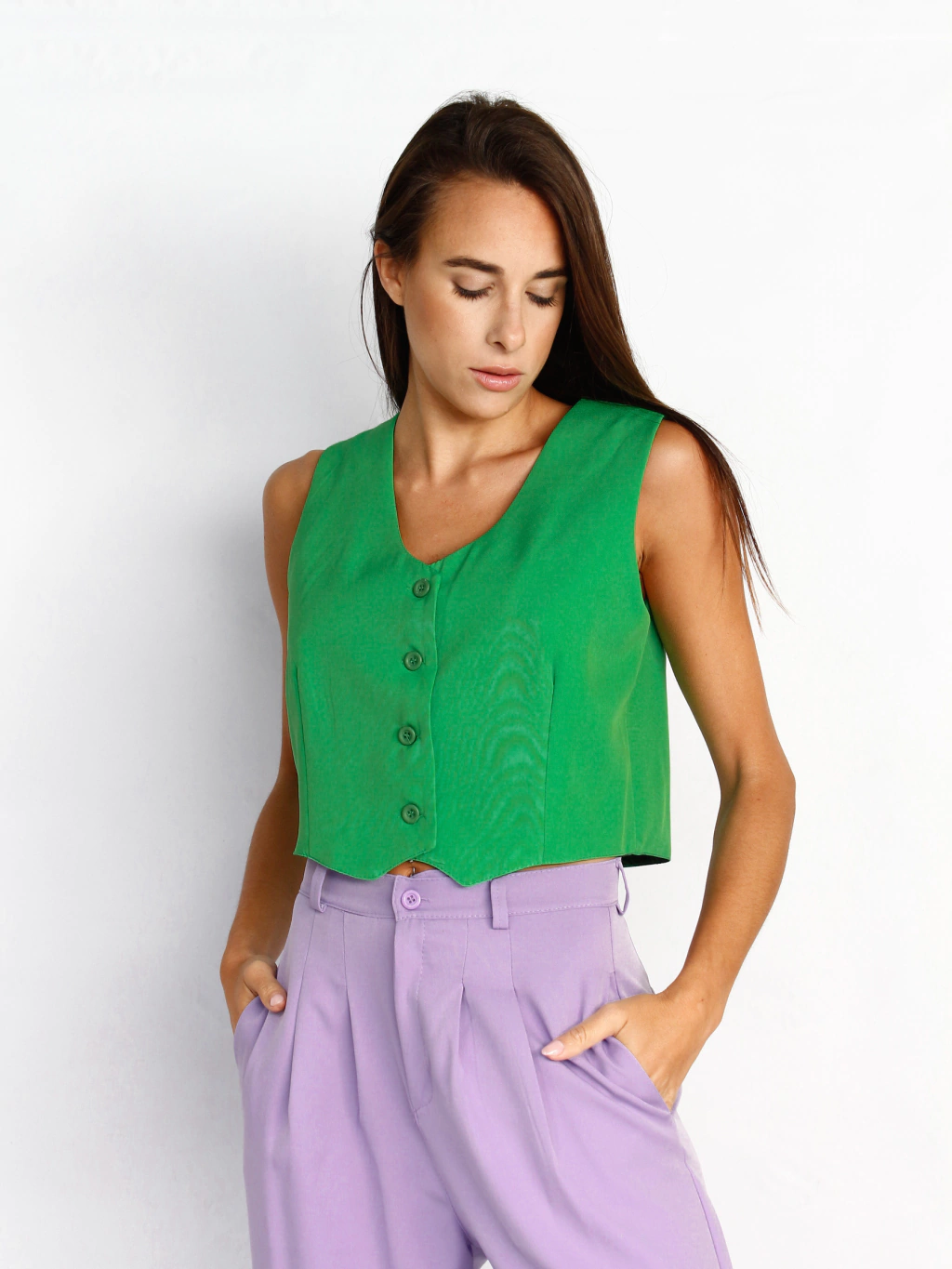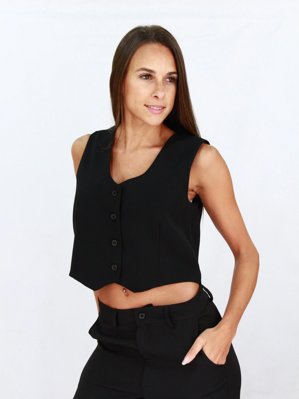 Chaleco en crep sarga sastrero. Abotonado corto, casi a la cintura. Sigue nuestra linea de sastreria, que esta andando muy bien.