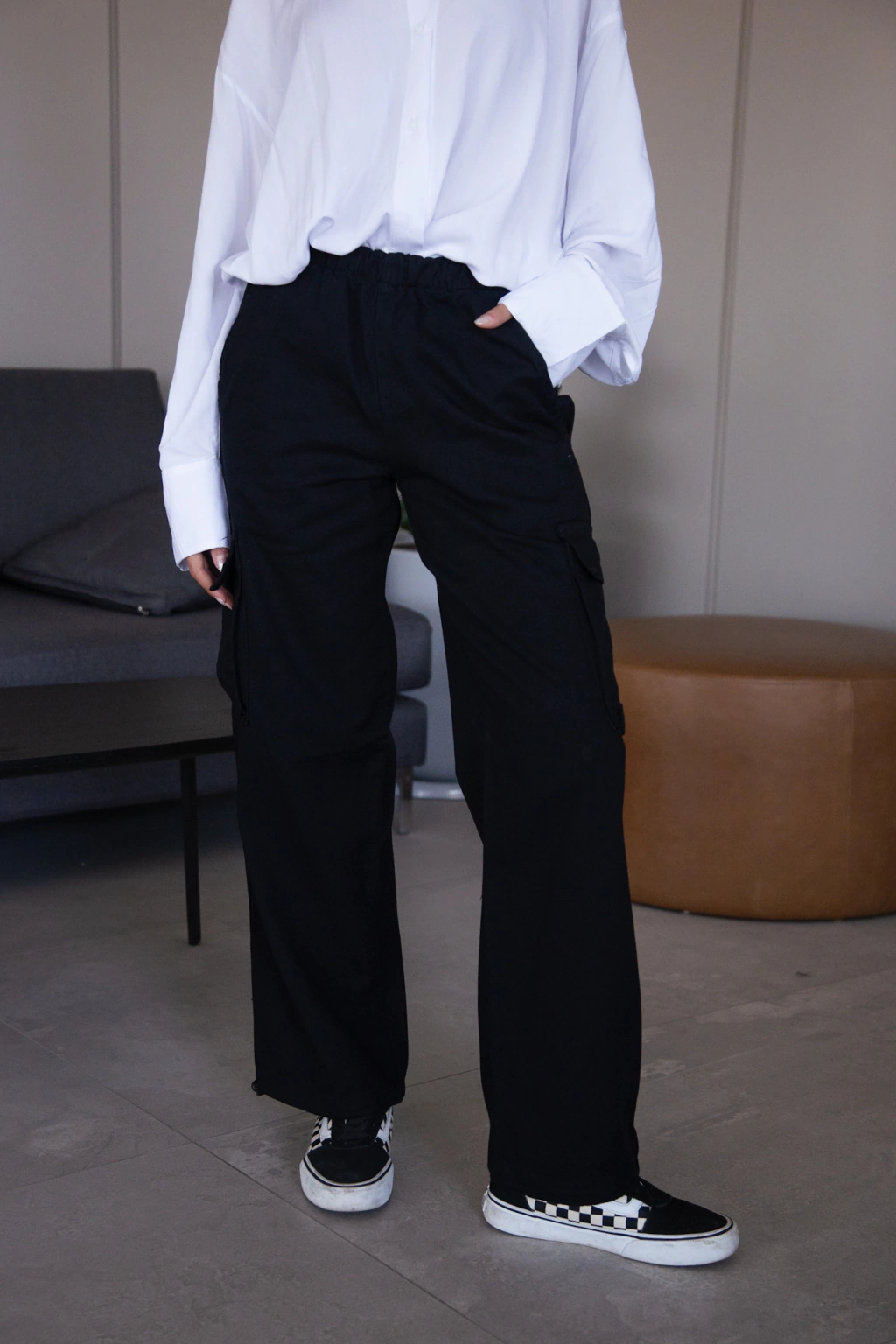 Panatalon cargo gabardina ancho. Elaztico en cintura y ajustable en bota manga. Bolsillos a los costados y traseros